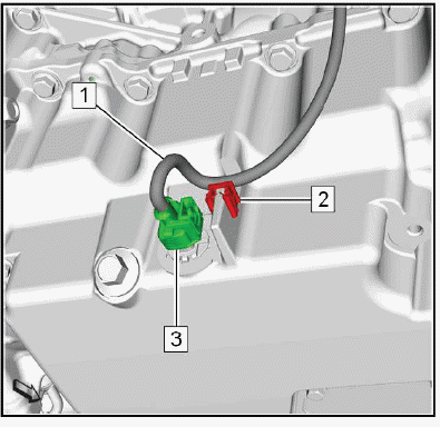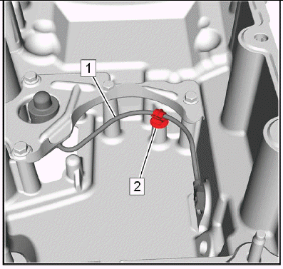 NOTE: Ensure the correct position of the engine oil level indicator switch connector retainer (1).