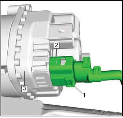 Depress connector tab (1) and disconnect the electrical connector (2) from the power steering assist motor(3).
