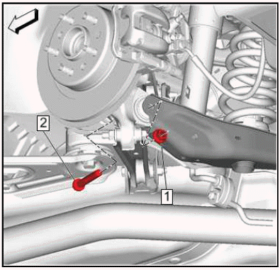 Raise the rear suspension lower control arm (1) back into position.