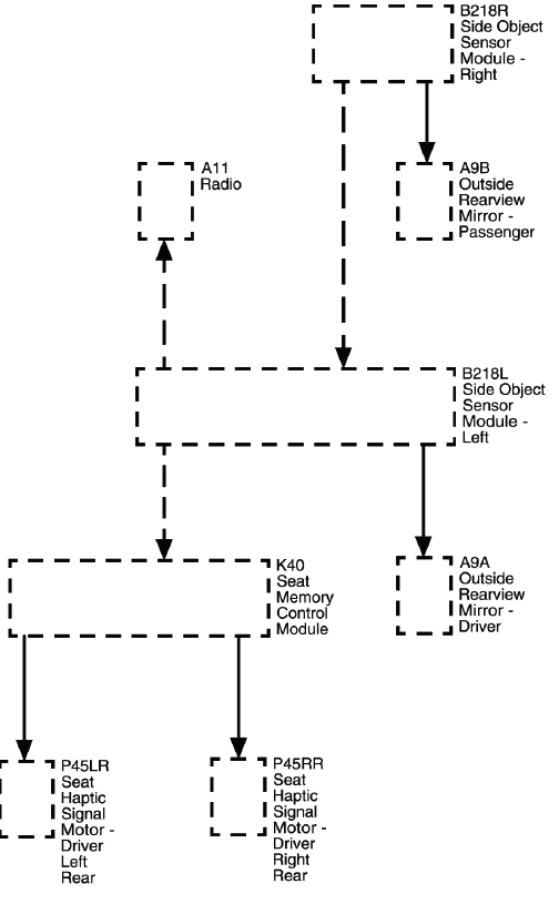 The side object sensor modules are located on each side of the vehicle behind the rear fascia and are not directly visible from outside the vehicle. The sensors use radar to determine the presence of objects nearby. When an object is detected in the side blind zone, the side object sensor module supplies voltage to illuminate the visual indicator on the appropriate side rear view mirror. Each sensor is supplied B+ and ground. The right sensor receives an additional ground. Both sensors communicate independently on the serial data line. The serial data enters the left sensor in a pass-thru configuration, that connects to the right sensor. The scan tool is able to individually communicate with each sensor.